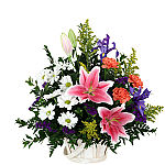 Is bountifully bedecked with a dazzling display of colour and beauty. Stargazer lilies stretch their fuchsia petals out amongst an arrangement of blue iris, white traditional daisies, pink or orange mini carnations, purple statice, and yellow solidago in a round whitewash handled basket, creating a delightful bouquet she will adore.