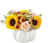 The FTD Autumn Orchard Bouquet is a delightful expression of the autumn season's vibrant colours and rustic charm. This handcrafted bouquet features a captivating blend of sunflowers, carnations, gerbera daisies, and chrysanthemums, all thoughtfully selected to create a rich tapestry of fall's finest blooms.