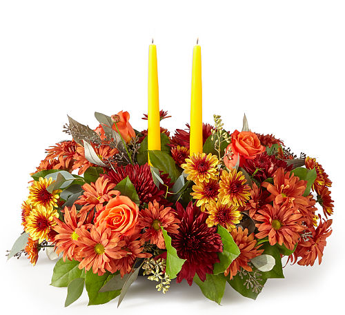 Cast your holiday meals in a whole new light with this lovely centerpiece, which draws from the season’s most stunning bronze, red and orange florals and foliage