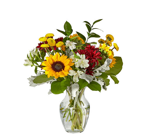 Please note that sunflowers are seasonal flowers, readily available from late summer to mid-autumn. Availability is limited at other times. When sunflowers are unavailable, large yellow Gerbera daisies or similar flowers may be substituted without notice.