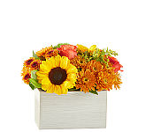 Echoes with the fiery colours of the autumn harvest. Sweet peach roses mingle with rusted red Asiatic lilies, orange spray roses and lush greens gorgeously arranged in a clear glass vase to create a warm display of captivating colour.