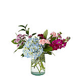 With its beautiful blend of roses, larkspurs, hypericum berries, Queen Anne’s Lace, trick dianthus, and Limonium, this artful arrangement could have inspired a Monet masterpiece.