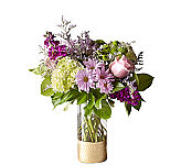 Created for the recipient that enjoys a fresh approach to fashion and design, this stunning flower bouquet is set to capture their every attention. range tulips, blue iris, blue hydrangea, and coral gerbera daisies are offset by lily grass blades, lush tropical leaves, and fresh greens while seated in a glass bubble bowl vase. A wonderful thank you, thinking of you, or Mothers' Day gift.