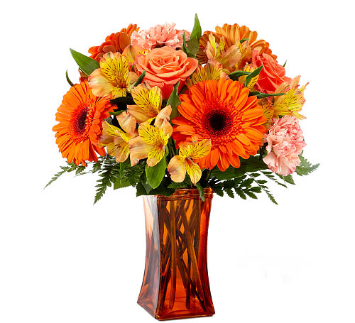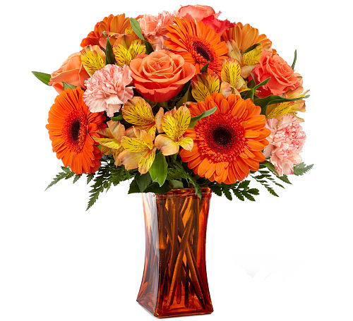 The FTD® Orange Essence Bouquet is a bright and sunny way to celebrate any of life's special moments! Bringing energy and beauty straight to your special recipient's door, this fresh flower arrangement unites orange roses, gerbera daisies, carnations and Peruvian Lilies along with lush greens, to create an incredible gift of flowers. Presented in a modern orange glass vase to give it a polished and finished look, the flower bouquet is a wonderful way to express your happy birthday, thinking of you, or congratulations wishes.