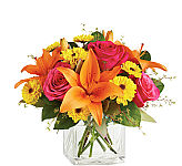 Is it time to celebrate their birthday? This fresh flower arrangement has you covered. Hot pink bi-coloured roses, orange Asiatic Lilies, green Fuji Chrysanthemums, hot pink mini carnations, tropical leaves, and lush greens are brought together to impress, presented in a clear glass vase. Bright, beautiful, and ready to get the party started, this bouquet creates a unique surprise to absolutely delight your recipient with each sunlit bloom.