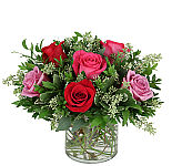 The FTD® Farewell Too Soon Bouquet is a blushingly beautiful way to convey your deepest sympathies for their loss. Pink and lavender roses are offset by pink Asiatic lilies, solidago and lush greens, perfectly arranged in a clear glass vase, to offer warmth and comfort to those facing the loss of their loved one.