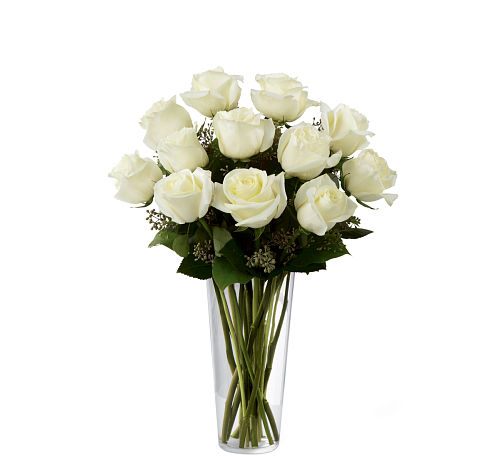 FTD® White Rose Bouquet. Express your sincere condolences with this beautiful bouquet of one dozen white roses with seeded eucalyptus, arranged in a glass vase.