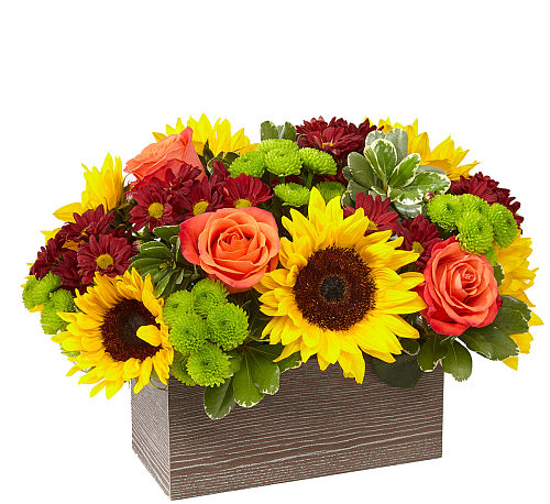 Delight your friends and family with an assortment of bright Autumn colours in a rustic, textured container.