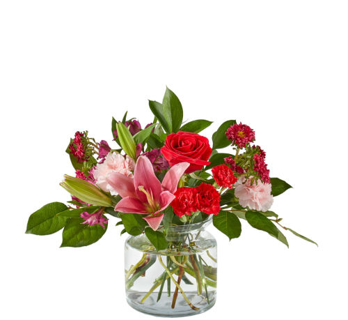 Entrance them with this charming arrangement of roses, carnations, alstroemeria, matsumoto asters, and LA Hybrid lilies in a cinched glass vase.