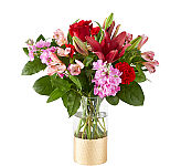 Unleash the love with this lavish blend of roses, scabiosa, snapdragons, Sweet William, and LA Hybrid lilies set in a gold-dipped vase.