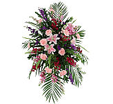 A symbol of your enduring love is beautifully expressed through a softly feminine wreath. Featuring roses, carnations, and gerbera in gentle tones of pink and purple, this arrangement is appropriate to send to the funeral home or service.
