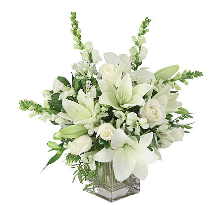 Remember them with this contemporary cube vase of white and cream flowers. Our Canada Flowers design features white lilies with white alstroemerias, white stock or snapdragons and white or cream roses.