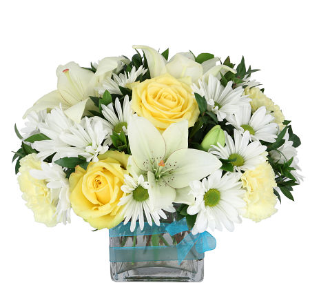 A lovely sun-lit arrangement tied with a perfect blue bow, featuring white lilies and daisies, soft yellow carnations and yellow roses in a glass cube vase. Just perfect.