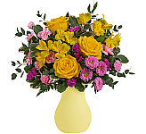 Looking to start your day with a burst of sunshine and cheer? Look no further than our Rise n' Shine Arrangement! Inspired by the early bird herself, Birdie, this playful bouquet is sure to put a smile on your face. Our Rise n' Shine Arrangement features a delightful mix of yellow roses, pink and soft yellow carnations, pink statice, and matsumoto asters. Each flower is carefully selected for its vibrant colour and fresh beauty, creating a bouquet that's as cheerful as a sunny morning. Our Rise n' Shine Arrangement captures Birdie's spirit perfectly with its sunny yellow hues and playful mix of flowers. It's a fun and whimsical way to celebrate everyone's favourite early bird! Whether you're wishing someone a good morning, congratulating them on a job well done, or simply brightening their day, our Rise n' Shine Arrangement is the perfect choice. It's a thoughtful and joyful gift that's sure to make anyone's day a little brighter.