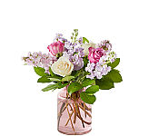Beautiful rose design featuring 3 lavender roses arranged in a bed of assorted greens along with 3 lush cream roses. This gift is florist arranged in a glass cube vase, tied with a matching bow and delivered fresh to the door.