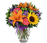 This basket comes with a feel good guarantee! A handled basket is arranged all-around with yellow sunflowers, lush red roses, orange gerbera daisies and red berries. Added to this are complementary greens and a matching bow. Bring on the goodness!