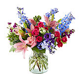 Premium sympathy gift of pink, burgundy and blue flowers. Lilies, delphinium, daisies, carnations, miniature carnations and limonium are elegantly arranged. This beautiful sympathy gift is a lovely way to show them that you are thinking of them.