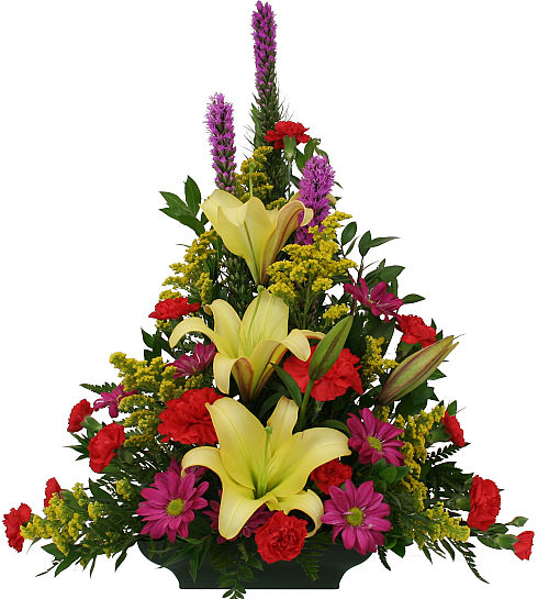 Send your very best wishes with this traditional florist arranged single sided arrangement, featuring lilies, liatris, carnations, daisies and solidago designed in a low dish.