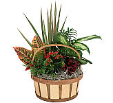 A handsome natural basket is arranged with a variety of living plants potted in soil, along with at least one flowering plant. Added to this are two or more sunny Gerbera daisies, inserted into the soil. Plants, flowers, and Gerbera together with a matching bow become a "sunrise planter".