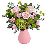 Go ahead, make them blush! This luxurious bouquet of roses, lilies and hydrangea in fresh shades of pink, peach and green is sure to put some cheerful color in their cheeks!