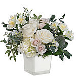 Send someone a bit of heaven with this beautiful bouquet. Luxurious crème roses and pure white lilies paint a peaceful picture inside a sapphire blue cube.