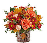 Warm as the autumnal sun, this joyful sunflower bouquet is perfectly presented in a glazed, food-safe ceramic pitcher that's adorned with a charming maple leaf.