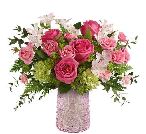 Delight Mom with Teleflora's Sparkling Joy Bouquet, delivered in a pink glass carafe with elegant beaded details. Paired with hot pink roses, pink spray roses, light pink alstroemeria, and other pretty blooms, this keepsake meets FDA tableware standards to safely serve and store drinks, adding beauty to any table year-round.