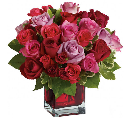 If you're crazy about someone and not afraid to show it, this bright jewel-toned arrangement is the perfect way to express your love. Featuring a sparkling array of roses and spray roses in a red-tinted glass cube vase. Lavender, red and hot pink roses along with coral and red spray roses arranged in a red-hot cube vase are an absolutely beautiful way to get your message across.
