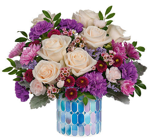 Springtime beauty at its best! Creamy roses and deep purple blooms are oh-so-alluring in this shimmering, stained glass mosaic vase.