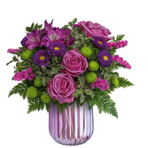 Like a sparkling amethyst, Teleflora's Luxurious Purple Bouquet is an alluring lavender rose arrangement in an iridescent glass vase that captures the heart.