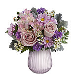 "Graceful and gorgeous" describes this stunning array of pastel flowers in a charming lavender vase tied with a pink satin ribbon. This elegant bouquet features pink Asiatic lilies, yellow carnations, lavender cushion spray mums, yellow spray roses and pink roses accented with assorted greenery. Delivered in a lavender vase tied with a pink satin ribbon.