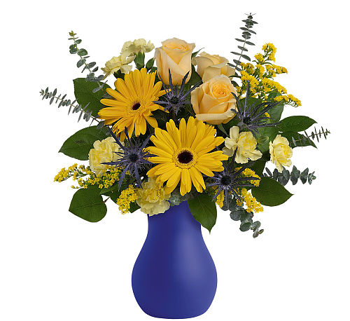 As glorious as the sunrise, this golden mix of roses and gerberas in a bold blue frosted glass vase radiates joy.