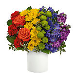 Like a glass of party punch, this juicy bouquet of bold pink, yellow and purple flowers will refresh and revitalize your lucky someone. Arranged in a shimmering Mercury Glass hurricane, it's one sweet treat!