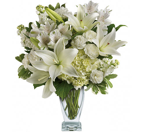 Who's the fairest of them all? This snow-white bouquet. A stunning statement of your purest love, this mix of hydrangea and lilies in a Couture vase will take their heart away. This snow-white bouquet includes hydrangea, asiatic lilies, alstroemeria, miniature carnations, stock and fresh green pittosporum.