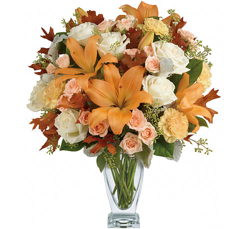 Add sophistication to the season with this gorgeous autumn arrangement. These striking lilies and roses are sure to brighten anyone's day.