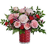 Send someone special a sparkling token of your affection with this gorgeous pink and red bouquet. Romantic as can be, the mix of roses and carnations is beautifully arranged in a chic mercury glass vase. It's an instant classic!